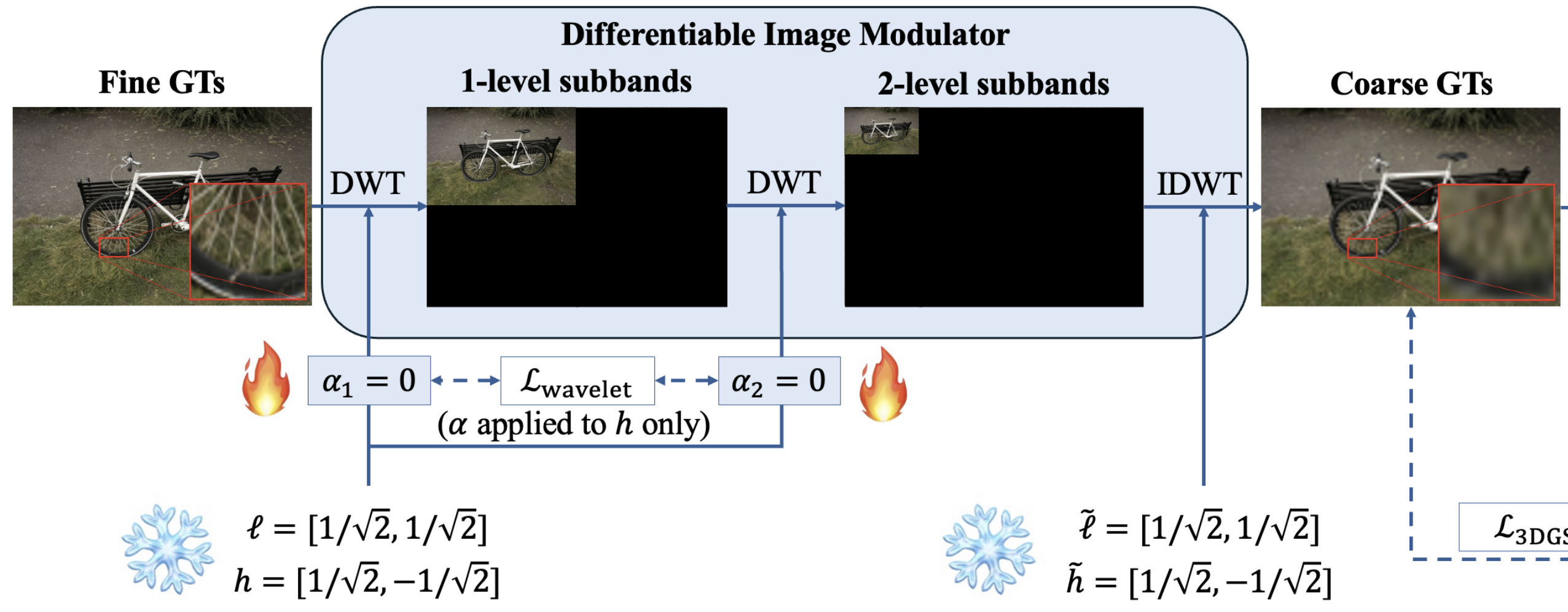 ![]() | Learnable Multi-level Discrete Wavelet Transforms for 3D Gaussian Splatting Frequency Modulation Hung Nguyen, An Le, Truong Nguyen arXiv preprint, 2026. [paper] |